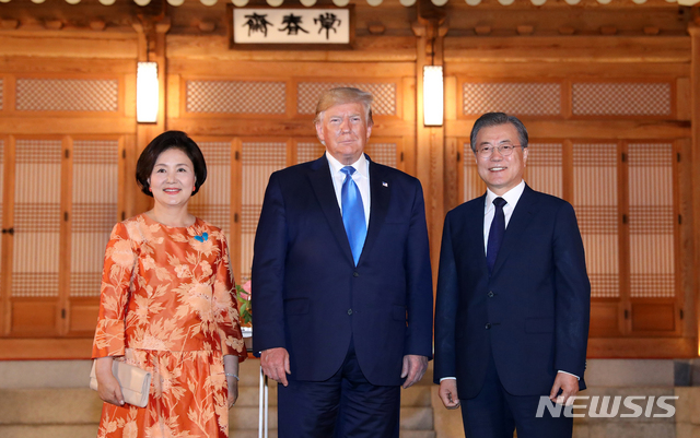 청와대에 초청된 트럼프 대통령을 문재인 대통령과 김정숙여사가 맞이했었는데.. 이때 김정숙여사는 악세사리로 파란나비를 착용하였었습니다.