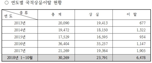 국적이탈자의 경우는 올해 증가 원인이 다소 특별하다. 국적 이탈자 수는 연간 1천명 안팎이었다가 2017년 1천905명으로 크게 늘었고, 올해는 10월까지만 6천478명이 이탈자로 집계됐다.
