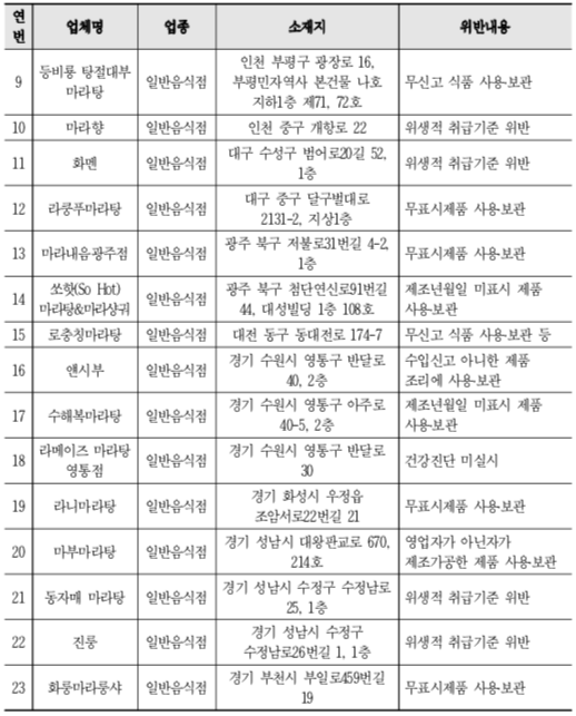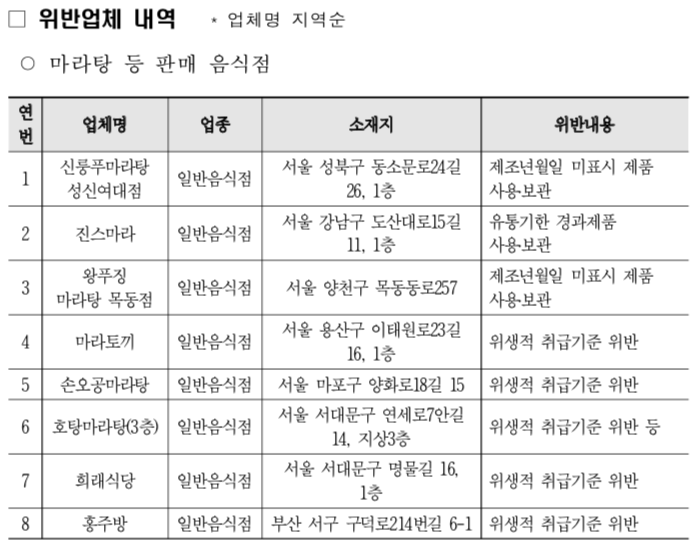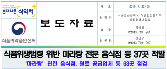 □ 식품의약품안전처(처장 이의경)는 최근 중독적인 매운맛으로 마라 요리 열풍을 일으키며 곳곳에 생겨나고 있는 마라탕 전문 음식점 등 63곳을 대상으로 위생 점검을 실시한 결과, 식품위생법령을 위반한 37곳을 적발했다고 밝혔습니다.