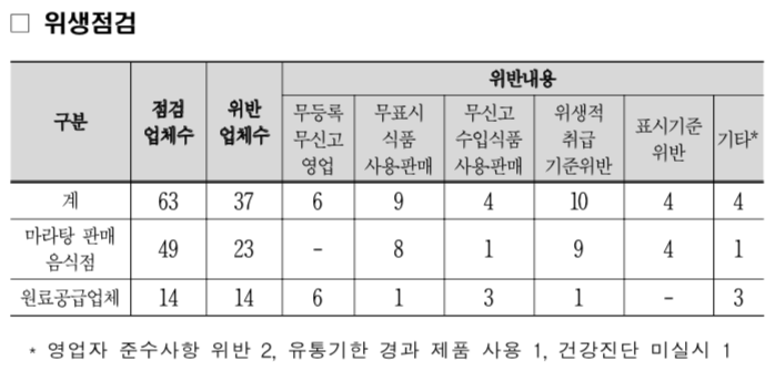 ○ 이번 점검은 지난 6월 3일부터 7월 5일까지 중국 사천지방 요리인 ‘마라탕’, ‘마라샹궈’ 등을 판매하는 음식점 49곳과 이들 음식점에 원료를 공급하는 업체 14곳을 대상으로 실시했습니다.