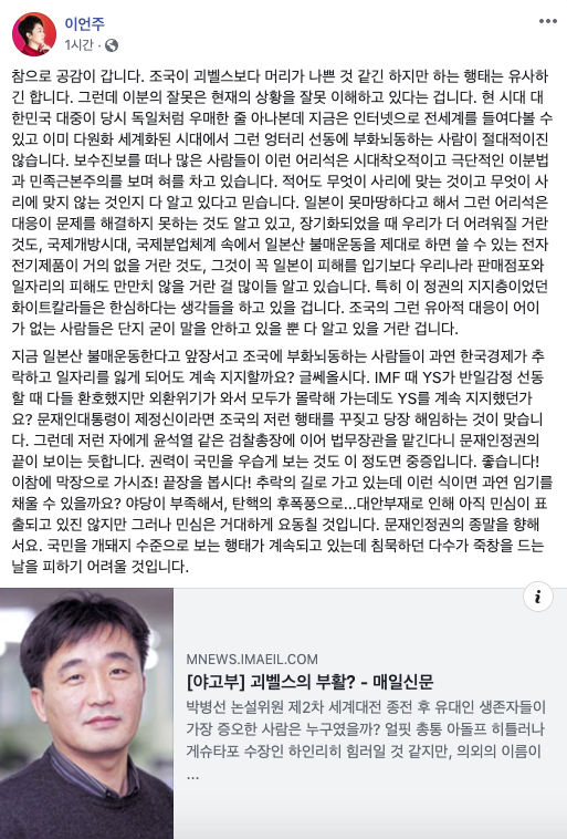 결국 이언주의원은 친일 국회의원임을 증명해주고 있습니다. 한국인들이 일본의 경제보복에 맞서서 자발적으로 불매운동을 하는 것을 선동당해 하는 것이라 주장하고 있습니다.