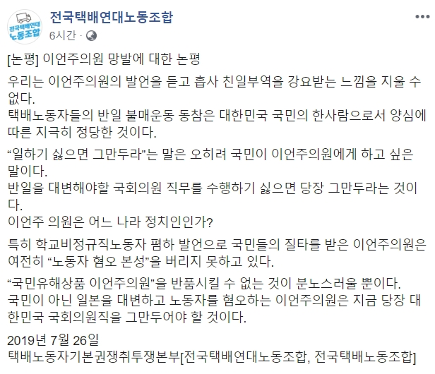 택배연대노조 페이스북에 게시된 논평에서 노동자들은 “이언주 의원의 발언을 듣고 흡사 친일부역을 강요받는 느낌이었다”며 “택배노동자의 반일 불매운동 동참은 국민의 한사람으로서 양심에 따른 지극히 정당한 것”이라고 강조했다.