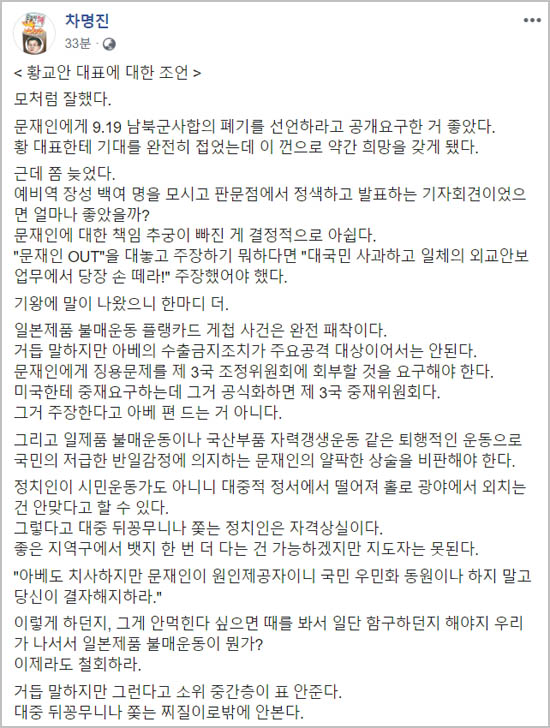 그는 황 대표가 문재인 대통령을 상대로 ‘9.19 남북군사합의 폐기를 선언하라고 공개요구한 건 좋았지만 일제 불매운동에 동참한 것은 잘못이라고 평가했다. 대중의 인기에 영합해 일제 불매운동에 동참하기보다 진짜 원인 제공자인 문재인 대통령을 비판해야 한다는 것이다.