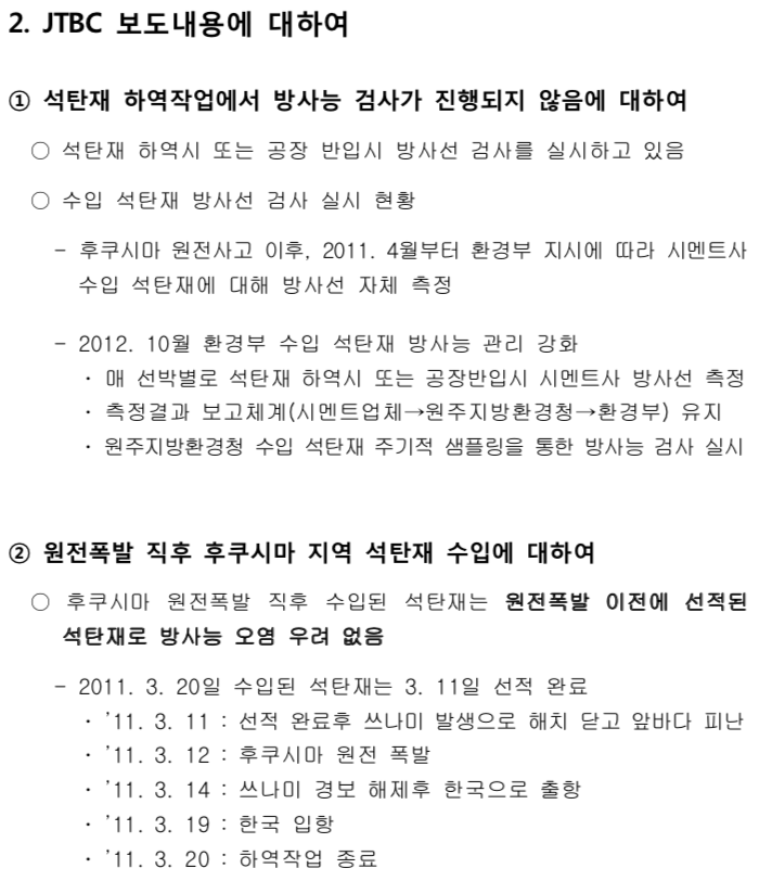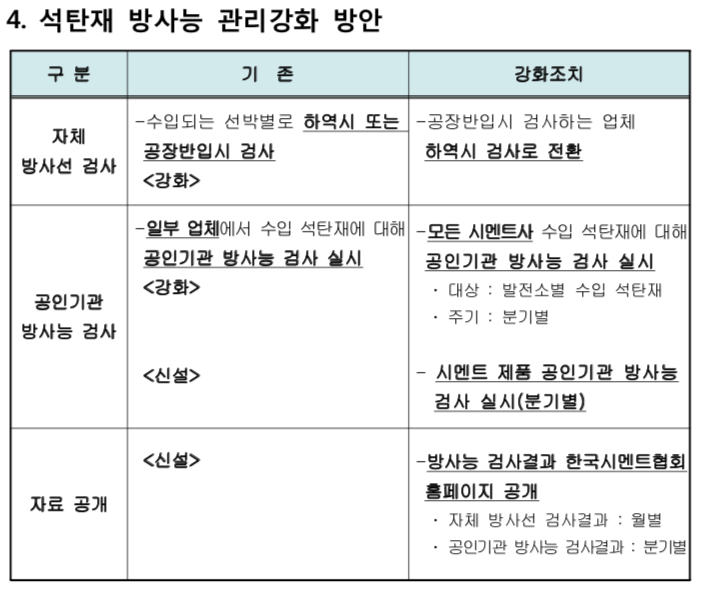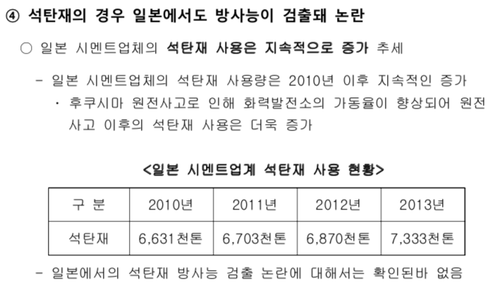 일단 시멘트업계에선 방사능 검사를 실시하고 있고 후쿠시마 원전 사고 이후 후쿠시마 지역의 석탄재 수입을 중단했다 밝혔었습니다.