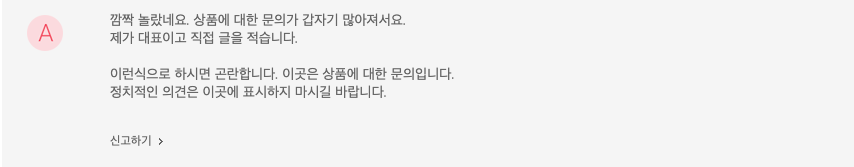 판매자는 일일이 답글을 달아 "상품에 대한 문의가 갑자기 많아져 깜짝 놀랐다"면서도 "이런식으로 하시면 곤란하다. 이 곳은 상품에 대한 문의다. 정치적인 의견은 이 곳에 표시하지 마시길 바란다"라고 당부했다.