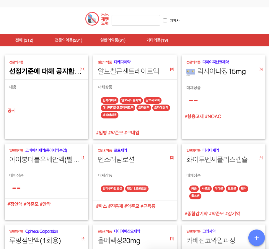 노노재팬드럭이라는 사이트입니다. 이 사이트는 노노재팬과는 다르게 의약품에 대한 정보를 제공합니다. 의약품일 경우 일본제품을 대체할 의약품에 대해선 전문 약사들만이 알 수 있었습니다. 그래서 약사의미래를준비하는모임에서 정보를 모아 만든 사이트입니다.