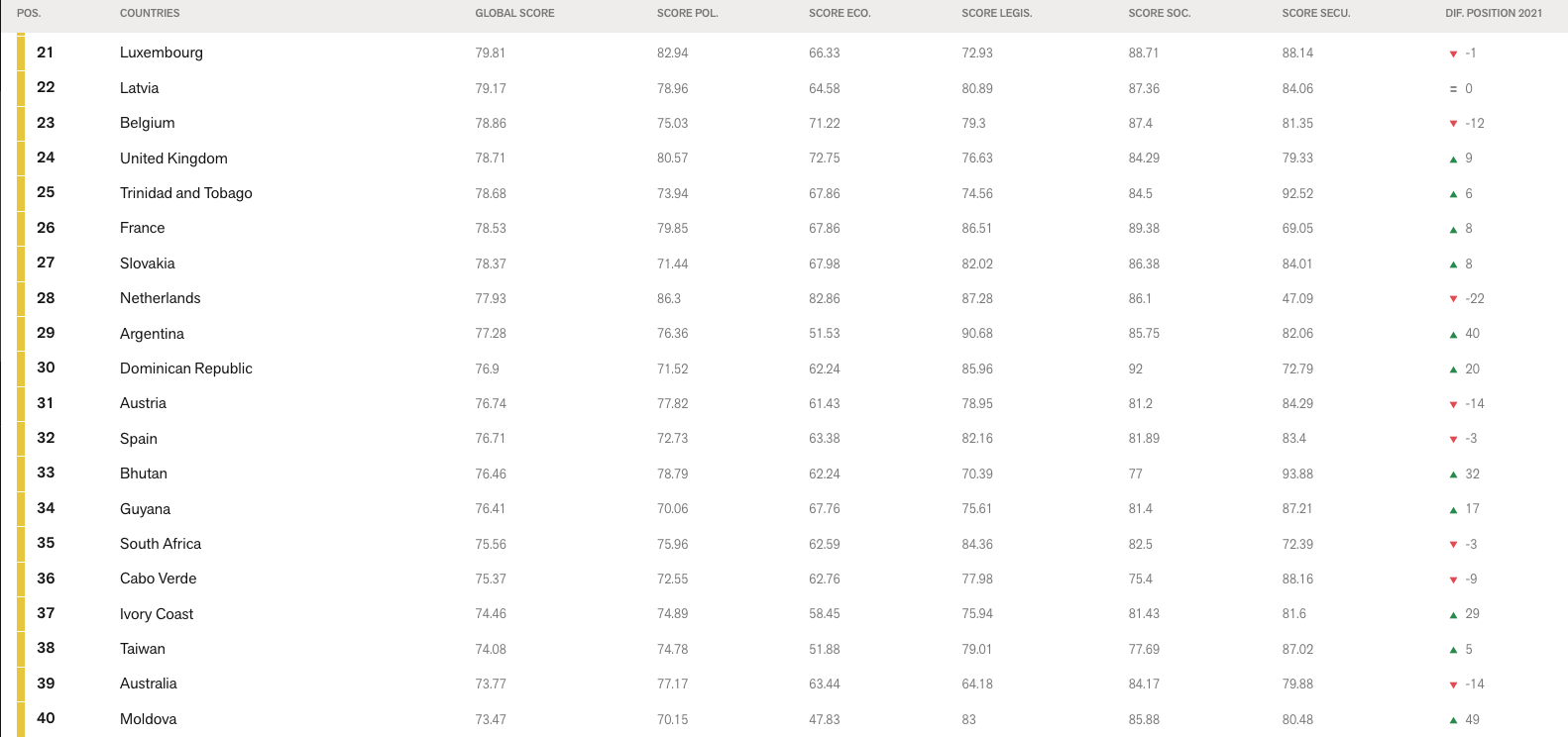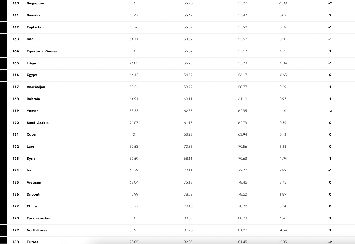 각 연도의 자료는 각 나라의 (순위)와 점수를 포함한다. 낮은 점수를 가진 국가일수록 더 높은 언론 자유도를 가지고 있다고 평가된다.