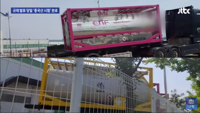 그런데 이달부터 일본산이 아닌 중국 DFD사의 불산을 실은 탱크로리가 수시로 공장을 드나드는 모습이 포착됐습니다.