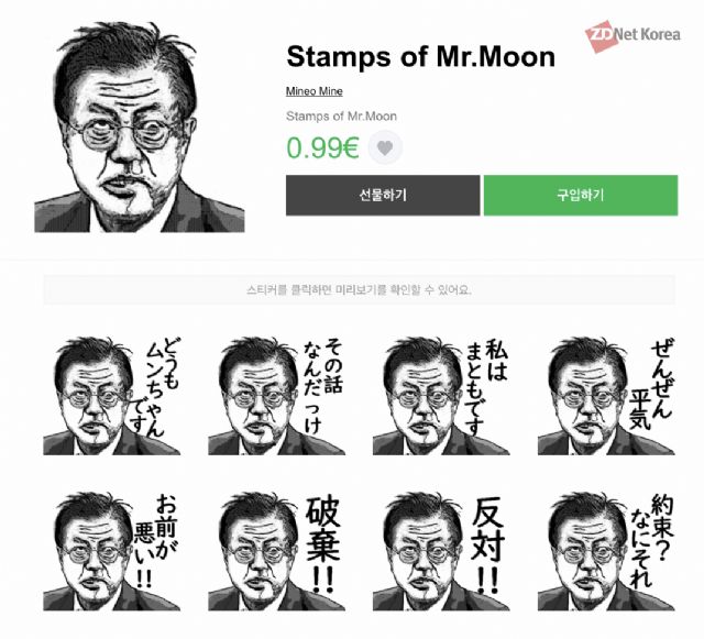 29일 온라인 커뮤니티 등에 따르면 최근 라인은 온라인 스토어인 ‘라인 스토어’(LINE Store)에서 ‘Stamps of Mr. Moon’(미스터 문의 도장)이라는 메신저용 스티커를 1200원에 판매했다.