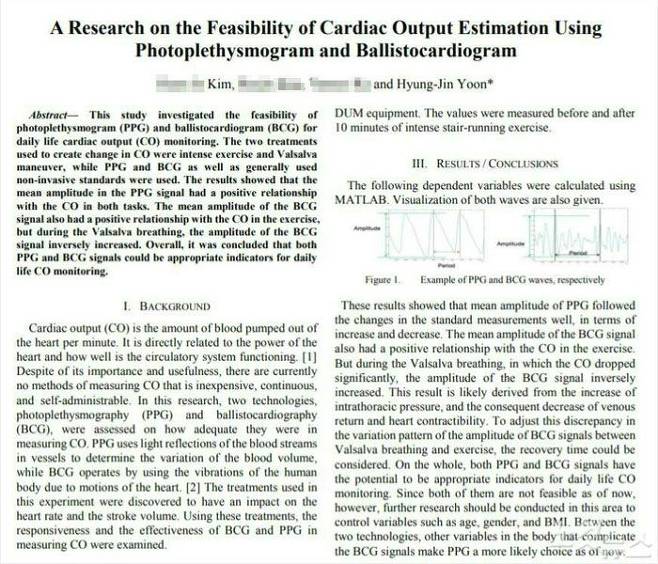 논문 형식으로 간단히 쓰여진 포스터의 제목은 "광전용적맥파와 심탄동도를 활용한 심박출량의 타당성에 대한 연구(A Research on the Feasibility of Cardiac Output Estimation Using Photoplethysmogram and Ballistocardiogram)"로, 포스터가 발표된 학술회의는 의생명공학 분야에서 세계적 권위를 인정받는 'IEEE EMBC(전기전자기술자협회 의생체공학컨퍼런스)'다.