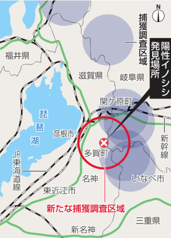 今回見つかったのは、野生イノシシへの感染が相次いで確認された岐阜、三重両県の県境に近く、三重県の発見場所から半径10キロ以内の「捕獲調査区域」(国の防疫指針に基づき設定)だった。