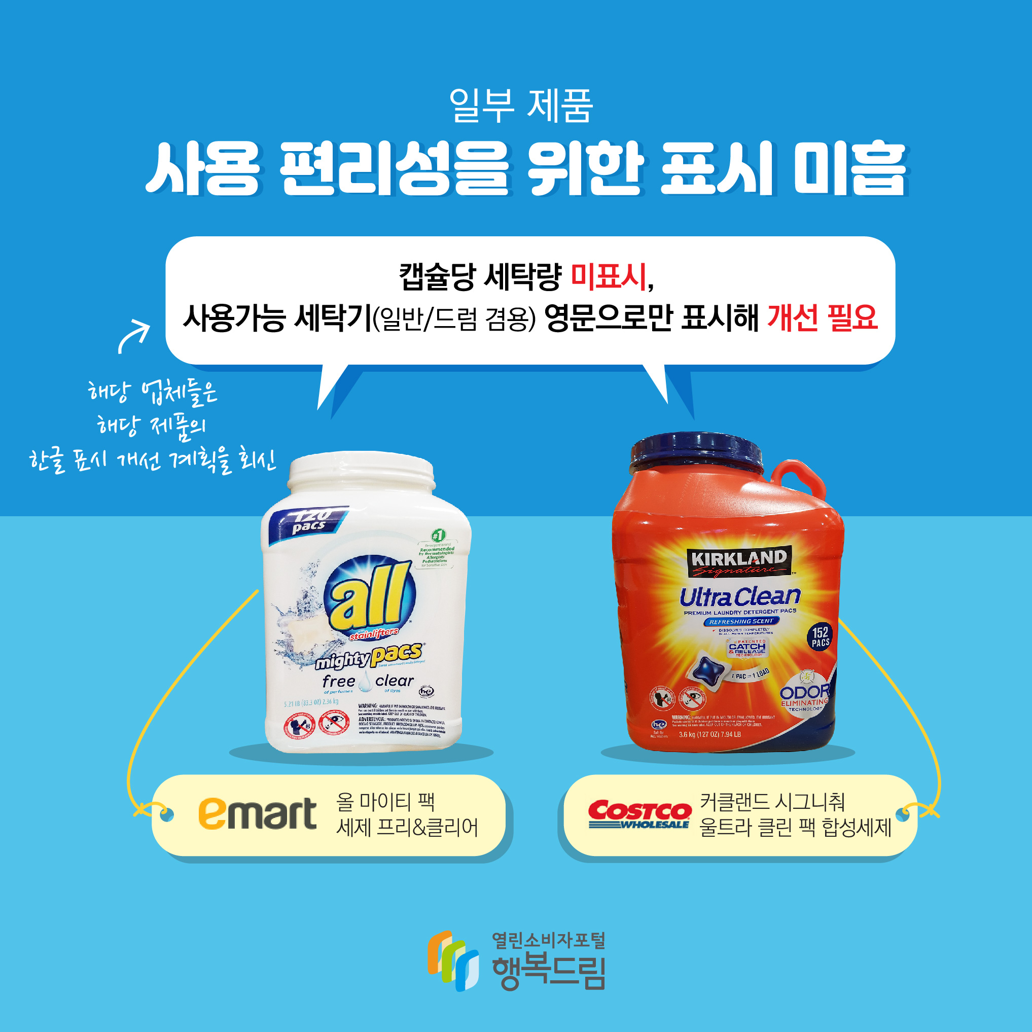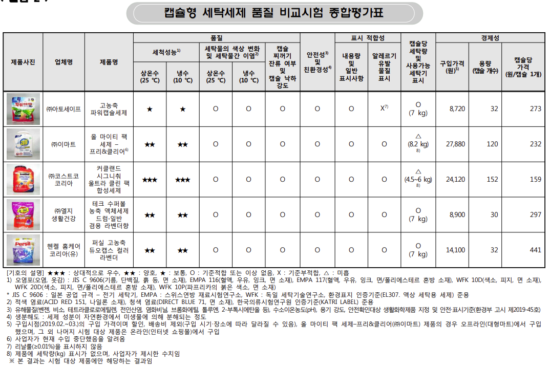 다만 표시적합성에서 26종에 대한 알러지 유발 물질 표시에서 1개 제품(고농축 파워캡슐세제)이 표시가 누락됐고, 2개 제품(올 마이티 팩 세제 프리&클리어, 커클랜드 시그니춰 울트라 클린 팩)은 캡슐당 세탁량 및 사용가능 세탁기 표시에서 ‘미흡’ 판정을 받았다.