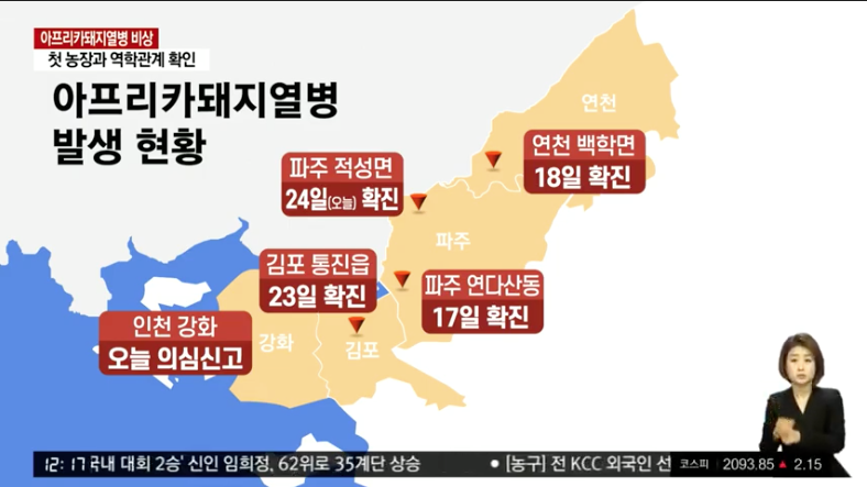 지난 17일 경기 파주시 연다산동의 돼지농장에서 국내 첫 아프리카돼지열병 확진 판정이 나온 이후 18일 연천군 백학면, 23일 김포시 통진읍, 24일 파주시 적성면에서 차례로 아프리카돼지열병이 발생했다. 지난 20일 경기 파주시 적성면과 파평면의 돼지농장에서 접수된 아프리카돼지열병 의심 신고 2건은 정밀검사 결과 모두 음성인 것으로 확인됐다.