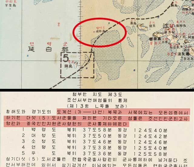 ㄴ.본 정전협정이 효력을 발생한 후 10일 이내에 상대방은 한국에 있어서의 후방과 沿海島嶼(연해도서) 및 海面(해면)으로부터 그들의 모든 군사역량 보급물자 및 장비를 철거한다. 만일 철거를 연기할 쌍방이 동의한 이유 없이 또 철거를 연기할 유효한 이유없이 기한이 넘어도 이러한 군사역량을 철거하지 않을 때는 상대방은 치안을 유지하기 위하여 그가 필요하다고 인정하는 어떠한 행동이라도 취할 권리를 가진다. 上記(상기)한 沿海島嶼(연해도서)라는 용어는 본 정전협정이 효력을 발생할 때에 비록 일방이 점령하고 있더라도 1950년 6월 24일에 상대방이 통제하고 있던 섬들을 말하는 것이다. 단 황해도와 경기도의 도계선 북쪽과 서쪽에 있는 모든 島嶼(도서) 중에서 白翎島(백령도)(북위 37도 58분, 동경 124도 40분), 大靑島(대청도)(북위 37도 50분, 동경 124도 42분), 小靑島(소청도)(북위 37도 46분, 동경 124도 46분), 延坪島(연평도)(북위 37도 38분, 동경 125도 40분) 및 隅島(우도)(북위 37도 36분, 동경 125도 58분)의 島嶼群(도서군)들을 국제연합군 총사령관의 군사통제하에 남겨두는 것을 제외한 기타 모든 도서는 조선인민군 최고사령관과 중국인민지원군사령관의 군사 통제하에 둔다. 한국 서해안에 있어서 상기 경계선 이남에 있는 모든 도서는 국제연합군 총사령관의 군사통제하에 남겨 둔다.
