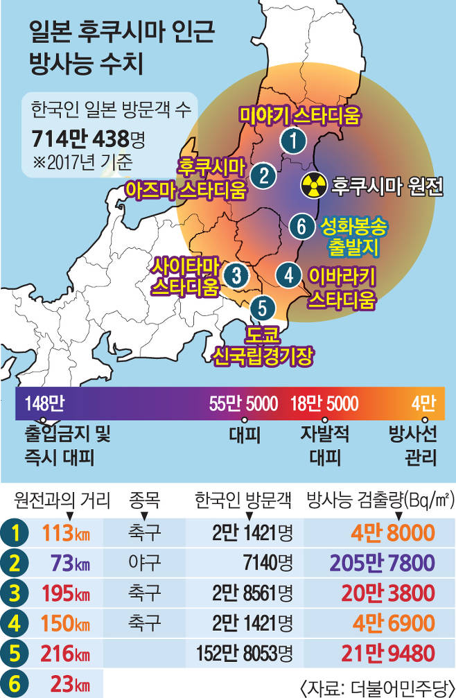 더불어민주당 일본경제침략대책특별위원회가 26일 일본의 후쿠시마 원전 사고로 인한 방사능 오염 지도를 제작해 공개했다. 지도에 따르면 2020 도쿄올림픽 경기장인 후쿠시마 아즈마 스타디움은 출입금지가 필요한 ‘즉시대피구역’으로 분류됐다.
