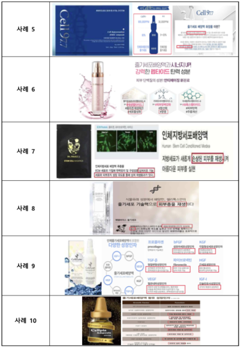 - 실제로는 ‘배양액’을 함유한 제품임에도 제품명이나 광고내용에 ‘줄기세포 화장품’ 등으로 표방하여 화장품 원료에는 사용될 수 없는 ‘인체 줄기세포’가 들어있는 것으로 소비자가 오인할 수 있도록 광고하거나,
