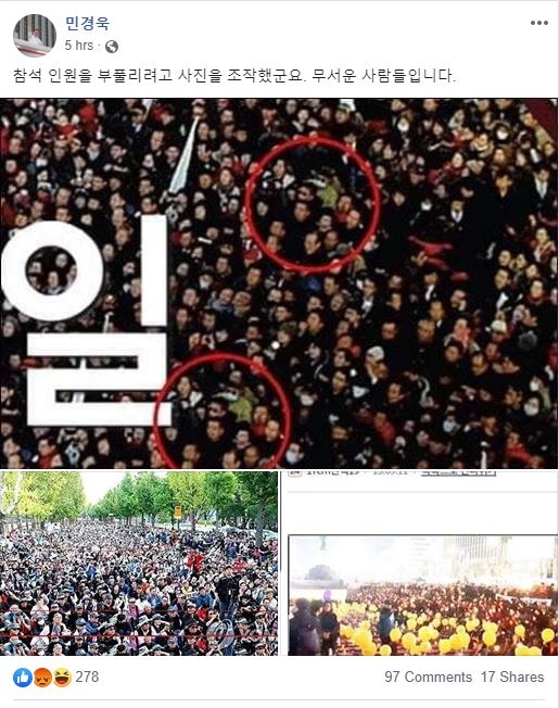 결국 민 의원의 주장대로라면, 지난 3일 자신의 소속 당이 주최한 집회를 보도한 사진에 대해 참가 인원 부풀리기 의혹을 제기하며 "무서운 사람들"이라고 비난하는 상황이다.