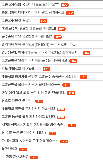 이런 발언에 대해 관내 읍·면과 본청 실과 전 직원들은 동요하는 상황이고.. 이에 고흥군 홈페이지의 자유게시판에는 이를 항의하는 글이 도배가 되고 있습니다.