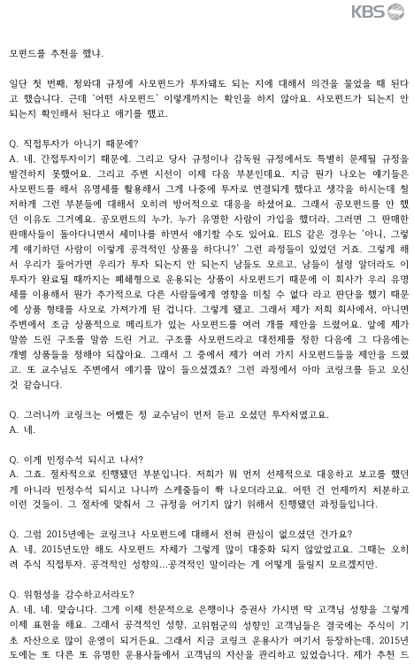 하지만 인터뷰에선 자신이 코링크의 사모펀드에 대해 알기 위해 직접 가입을 할려 했으나 이미 다 찼고 이후 추가 모집을 하지 않아 가입을 할 수 없었다고 밝혔습니다. 이걸 거부당했다고 판단하고 보도내용에 올린 것 같네요...