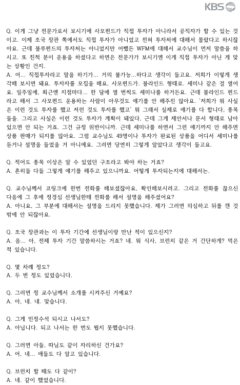 또한 정교수로부터 조국장관이 이런 펀드 운용등에 관련된 내용을 전달 받았다면 공직자윤리법 위반 가능성이 있다 언급했는데 인터뷰에선 전달받았다는 정황이 담긴 내용은 없었기에 해당 내용은 그냥 KBS의 추측입니다.