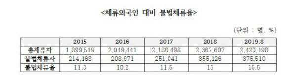 14일 국회 법제사법위원회 소속 채이배 바른미래당 의원이 법무부로부터 제출받은 국정감사 자료에 따르면 지난 8월말 기준으로 국내 불법체류 외국인이 37만55510명에 이르는 것으로 확인됐다. 특히 지난해에는 불법체류자가 전년대비 10만명 이상 증가해 35만5126명을 기록했고 전체 외국인 체류자 대비 불법체류자 비율도 11.5%에서 15%로 급상승했다. 올해도 불법체류자 비율이 15.5%까지 오른 것으로 확인됐다.