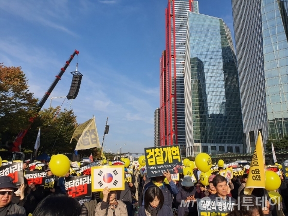 '사법적폐청산 범국민 시민연대(범국민연대)'는 26일 오후 4시부터 여의도공원 앞 사거리에서 제11차 촛불문화제를 열었다. 집회 참가자들은 이날 이른 오후부터 여의도공원을 찾았다. 주최 측은 이날 10만명이 참여할 것으로 추정했다.