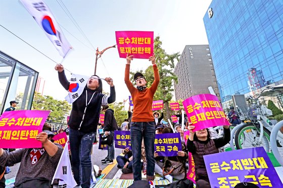 집회에는 공수처 설치를 반대하고 '조국 구속' '문재인 탄핵' 등 정권퇴진을 요구하는 손팻말이 눈에 띄었다. 이들은 구속 된 정 교수에 이어 조 전 장관도 구속수라를 해야 한다고도 목소리를 높였다.