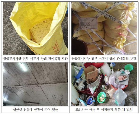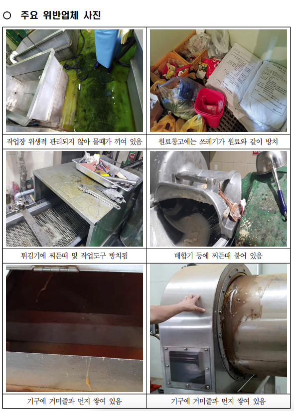 - 또한 작업장 안에 있는 분쇄기, 혼합탱크, 건조탱크 등 제조시설 외부에 찌든 먼지와 기름때를 방치하고 청소하지 않는 등 위생적 취급기준을 위반하여 적발되었습니다.