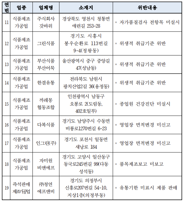 식약처가 식품제조, 가공업체를 상대로 집중점검하였으며 19곳의 규정 위반 업체를 적발하였습니다.