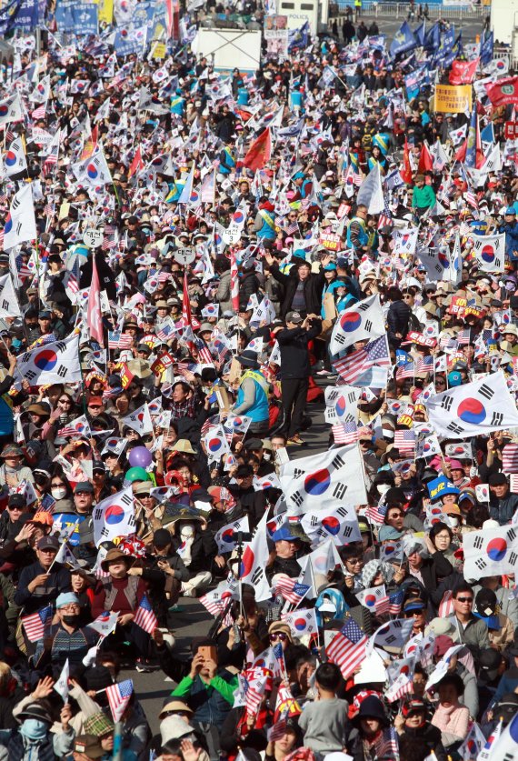 광화문 일대는 일부 외국인 관광객들을 제외하고는 집회에 참가하는 시민들과 태극기로 가득찼다. 교보문고 앞 전 차로를 비롯해 광화문 광장은 시간이 지날수록 모여드는 시민들로 발 디딜틈 없이 인산인해를 이뤘다. 어린 자녀들과 함께 집회에 참가한 가족 단위 시민들도 눈에 띄었지만 집회 참가자들 대부분은 40대 이상 중장년층이 주를 이뤘다.