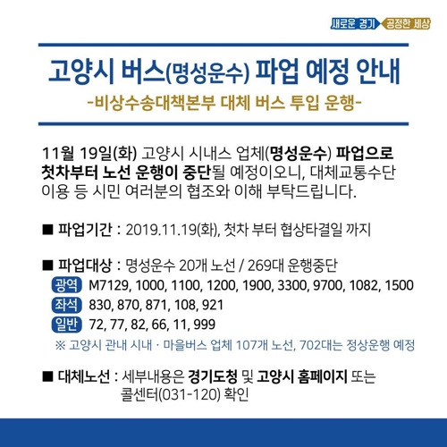 관련링크 : 고양시 시내버스 업체(명성운수) 노선 운행중단 알림(고양시청)
