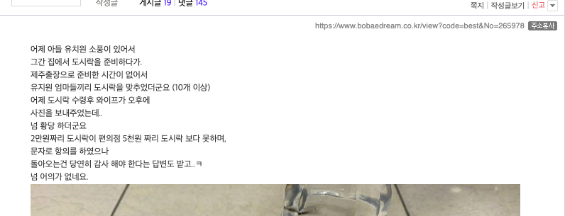 해당 도시락 업체는 과연 아무일 없었다는듯이 영업을 이어갈지도 궁금해집니다.. 초반 이미 도시락 업체의 연락처나 상호명이 퍼진 것 같으니..