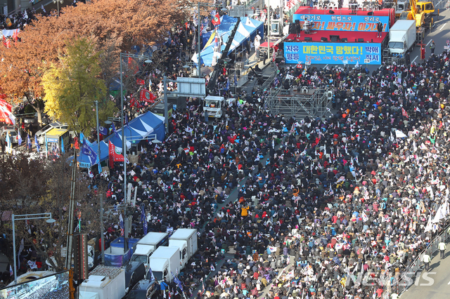 [서울=뉴시스] 천민아 기자, 김남희 김정현 최서진 수습기자 = 30일 서울 도심 곳곳에서 보수단체 집회가 열렸다. 이들은 서울 광화문과 여의도 등에서 자유한국당의 필리버스터를 지지하는 등 발언을 이어갔다.