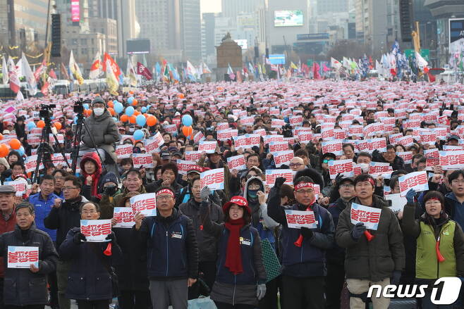 (서울=뉴스1) 서혜림 기자,윤다혜 기자 = 문재인 정권을 규탄하고 자유한국당 해체를 요구하는 대규모 민중대회가 열렸다. 주최측 추산 2만여명의 농민과 노동자들이 전국 각지에서 올라와 광화문 북측 광장에서 목소리를 높였다.