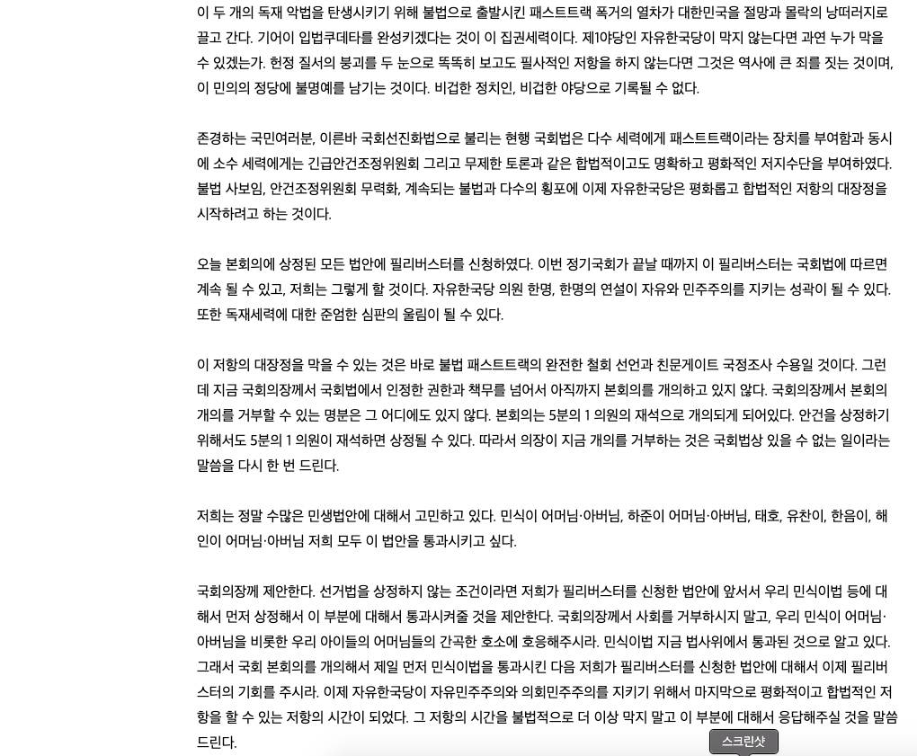오늘 본회의에 상정된 모든 법안에 필리버스터를 신청하였다. 이번 정기국회가 끝날 때까지 이 필리버스터는 국회법에 따르면 계속 될 수 있고, 저희는 그렇게 할 것이다. 자유한국당 의원 한명, 한명의 연설이 자유와 민주주의를 지키는 성곽이 될 수 있다. 또한 독재세력에 대한 준엄한 심판의 울림이 될 수 있다.