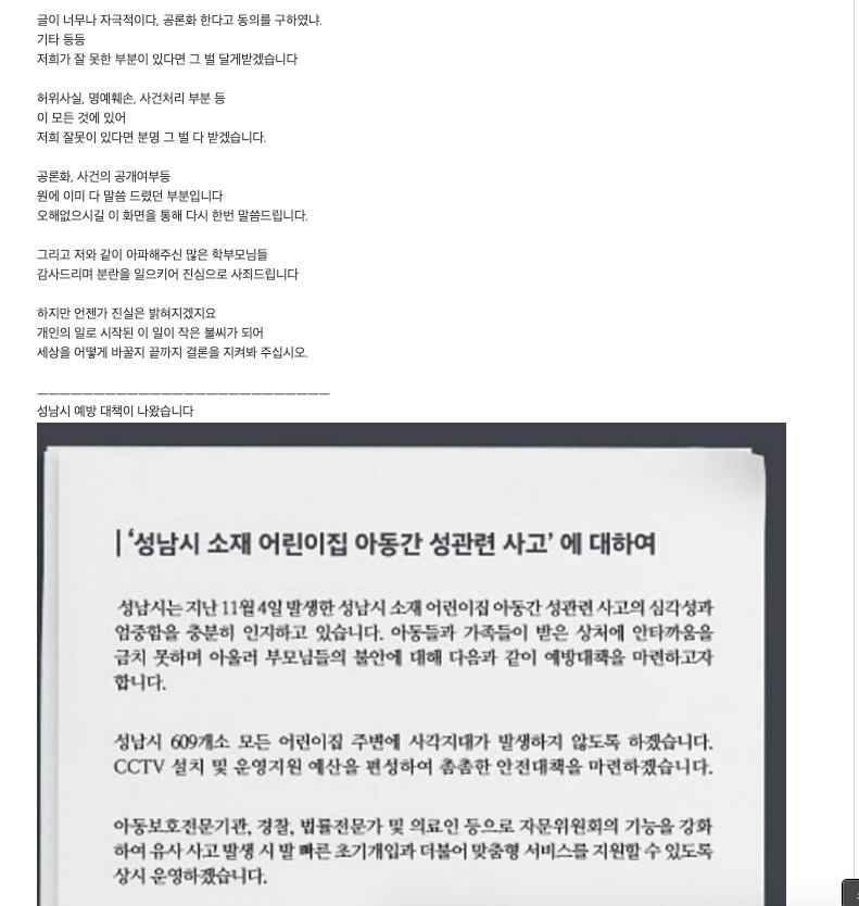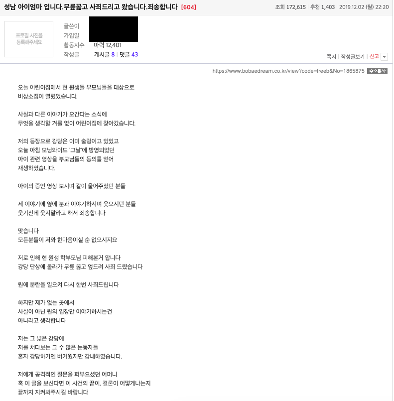 피해본 것도 억울할텐데 해당 어린이집에 가서 학부모들에게 분란을 만들어 죄송하다 무릎꿇고 사죄한 겁니다..