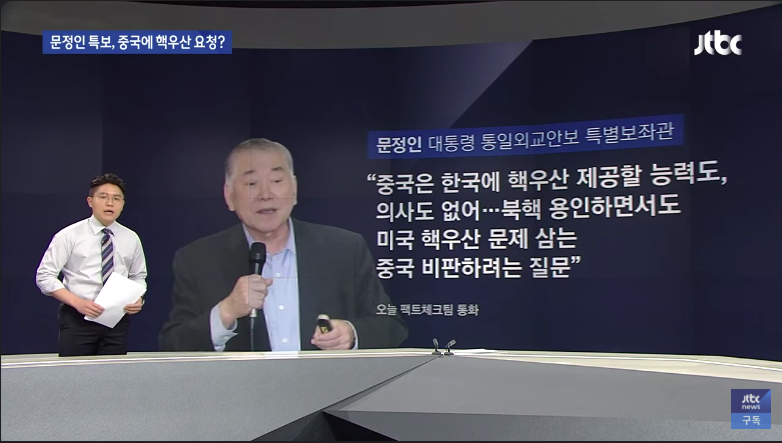 바로 팩트체크해 보겠습니다. 보면, 문 특보가 중국에 "우리나라에 핵우산을 제공해달라고 요청을 했다"라는 게 주된 내용인 거잖아요. 그러니까 미국 대신 중국한테 북한 핵 위협으로부터 우리를 보호해달라고 요청을 했다, 사실입니까?