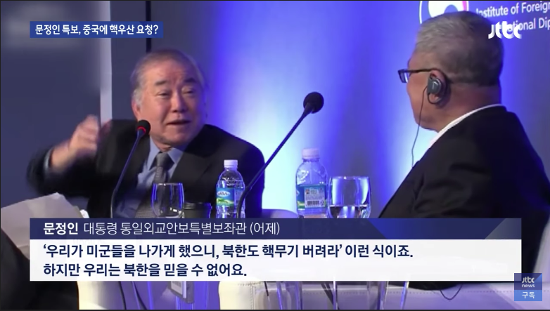 조선일보에 따르면, 이날 세미나의 사회를 맡은 문정인 대통령통일외교안보특별보좌관은 “북한 비핵화가 이뤄지지 않은 상태에서 주한미군이 철수하면, 중국이 한국에 핵우산을 제공하고, 그 상태로 북한과 협상하는 방안은 어떻겠느냐”는 질문을 중국 측 인사에게 던졌다. - 뉴데일리
