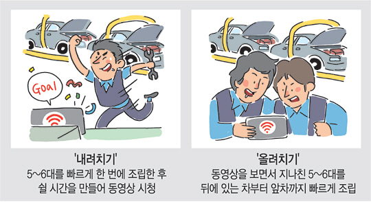 그동안 현대차 내에서는 생산 현장의 근무 상황을 놓고 논란이 많았다. 작업자가 컨베이어 벨트를 타고 내려오는 자동차를 미리 5∼6대씩 조립한 뒤 휴식을 취하는 소위 ‘내려치기’ 때문이다. 반대로 동영상을 보다가 자동차가 5∼6대 지나가 있을 때 뒤에 있는 차부터 앞차까지 빠르게 조립하는 ‘올려치기’도 한다. 이 때문에 휴식 시간이 아닌 근무시간 중에도 많은 작업자가 휴대전화를 보거나 휴식을 취하는 사례가 잦았던 것으로 알려졌다. 실제 울산 공장을 방문한 외부인들도 “작업대에 휴대전화나 태블릿 PC까지 올려놓고 영화·유튜브 등 각종 동영상을 보고 있었다”며 “이 같은 모습에 깜짝 놀랐다”고 했다.