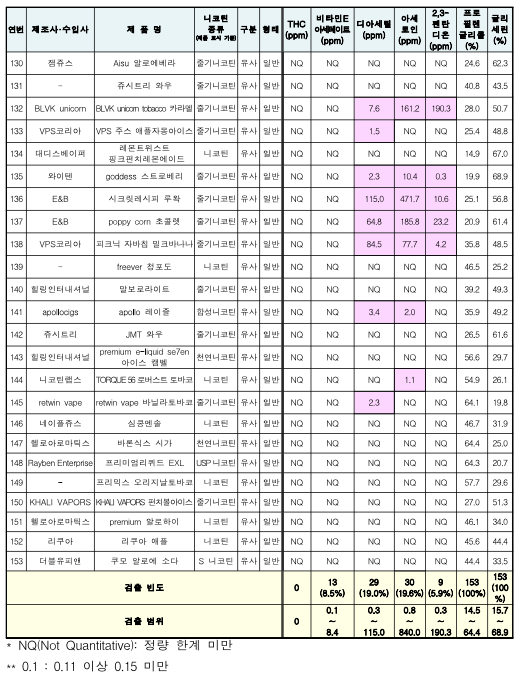 * 담뱃잎 추출 니코틴을 사용하여 담배사업법 상 담배로 분류되는 액상형 전자담배(이하 “담배”) 16개 제품 및 담배 줄기·뿌리 추출니코틴 또는 합성니코틴을 사용하여 담배로 분류되지 않는 액상형 전자담배(이하 “유사 담배”) 137개 제품