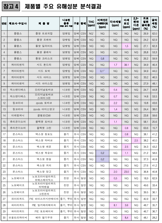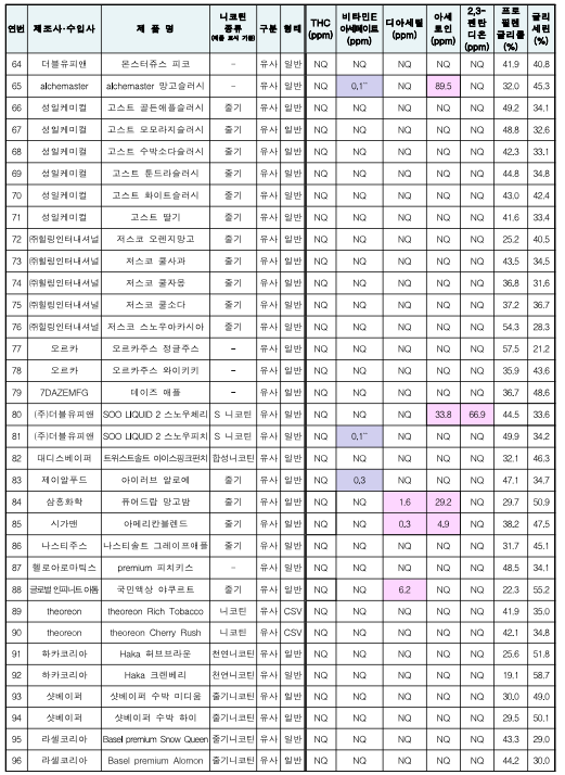 대마유래성분(THC), 비타민E아세테이트, 디아세틸(가향성분) 아세토인(가향성분), 펜탄디온(가향성분), 프로필렌글리콜, 글리세린의 검출여부를 조사했다고 밝혔습니다.