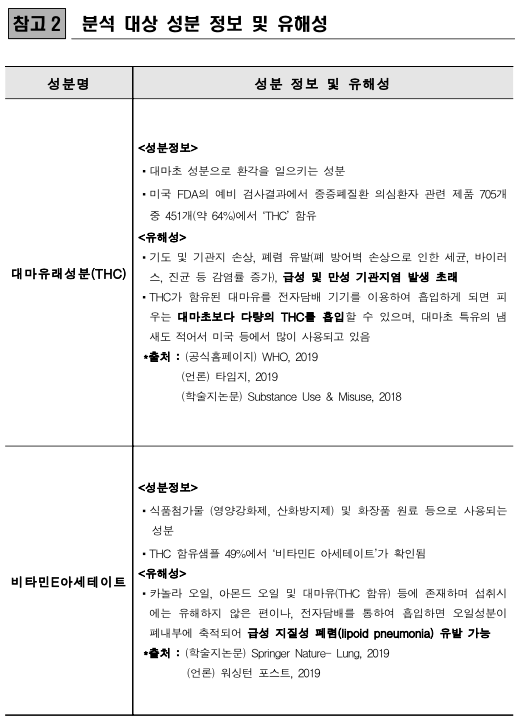제일 위험한 성분은 대마유래성분(THC), 비타민E아세테이트 두가지로 하나는 마약성분으로 급성 및 만성 기관지염을 발생초래를 유발하며 또하나는 급성 지질성 폐렴을 유발하는 물질입니다.