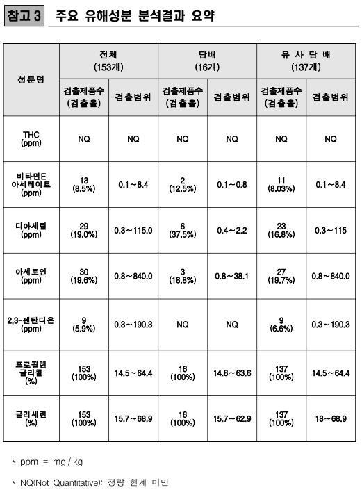 □ 식품의약품안전처(처장 이의경)는 지난 10월 23일 정부 합동으로 발표한 “액상형 전자담배 안전관리 대책”의 일환으로, 국내 유통되는 153개 액상형 전자담배*의 액상을 대상으로 대마유래성분(THC : TetraHydroCannabinol), 비타민 E 아세테이트, 가향물질 3종(디아세틸, 아세토인, 2,3-펜탄디온) 등 7개 성분에 대하여 분석한 결과,