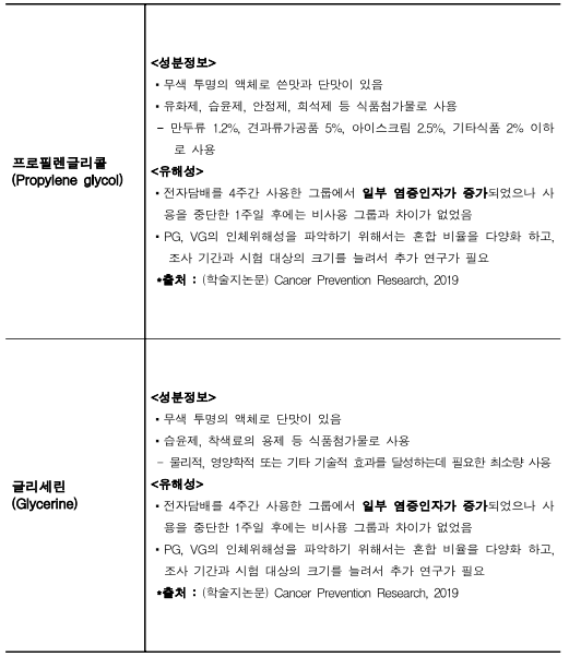 ○ 넷째, 액상형 전자담배 구성성분의 대부분을 차지하는 프로필렌글리콜(PG)과 글리세린(VG)은 담배와 유사담배의 모든 제품에서 검출되었다.