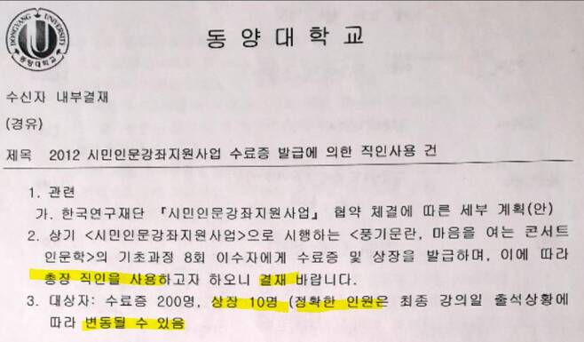 교양학부에서 만든 이 공문은 "이수자에게 수료증 및 상장을 발급하며, 이에 따라 총장 직인을 사용하고자 하오니 결재 바란다"면서 다음처럼 적었다. 정 교수도 교양학부 소속이다.