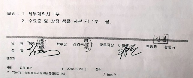 담당과 일부 직원의 결제가 있었지만 부총장과 총장의 결제사인이 없는 공문서네요..