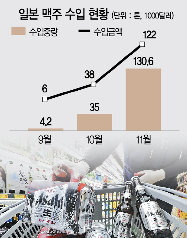22일 관세청에 수출입통계를 분석한 결과 지난해 11월 일본으로부터 들어온 맥주는 130.6톤(t) 규모로 금액은 12만 2,000달러다. 불매 운동이 벌어지기 이전인 지난 6월 일본 맥주 수입 규모가 약 790만 달러였다는 점을 감안 하면 크게 미비하지만 수입 최저점을 찍었던 9월부터 다시 늘어나는 추세다. 지난 9월 일본 맥주 수입은 4.2t, 6,000달러로 통계 작성 이래 일본 맥주 수입량이 가장 적었다. 이에 수출이 수입보다 많아 지난 9월 맥주에서만큼은 무역수지가 첫 흑자를 기록하기도 했다. 하지만 9월을 기점으로 10월에 이어 11월까지 두 달 연속 일본 맥주 수입이 늘어나는 추세다.