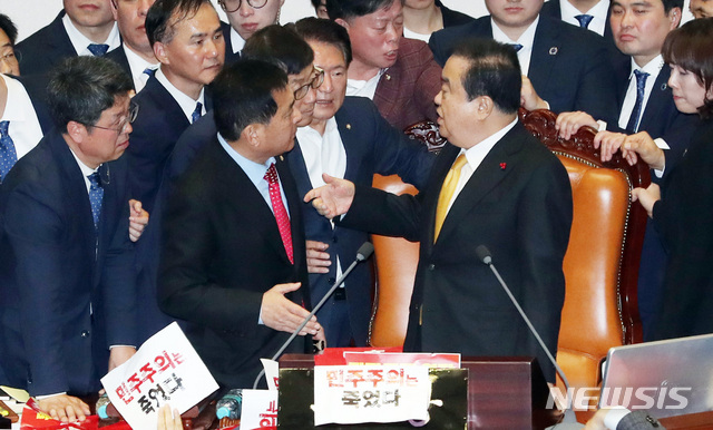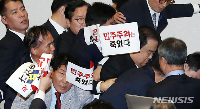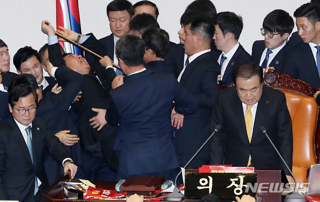 [서울=뉴시스] 이승주 윤해리 문광호 최서진 김남희 기자 = 문희상 국회의장은 27일 격렬하게 저지하는 자유한국당 의원 무리를 온몸으로 뚫고 의장석에 앉아 선거법을 기어코 통과시켰다. 그 과정에서 의장 및 방호 직원들과 한국당 의원들 사이에 몸싸움이 벌어지면서 국회는 아수라장이 됐다.