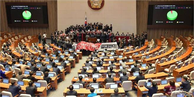 [서울=뉴시스] 문광호 기자 = 선거법과 공수처(고위공직자범죄수사처)법 처리를 두고 여야가 몸싸움을 벌이며 대치를 이어가는 가운데 국회 상황을 단적으로 보여주는 특별한 장면이 연출됐다.