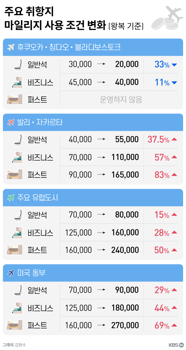 기존의 공제표를 바탕으로 보너스 항공권 구입 계획을 세워 온 소비자 입장에서는 사실상 계획 실현이 불가능해졌다는 하소연이 나오는 이유입니다.